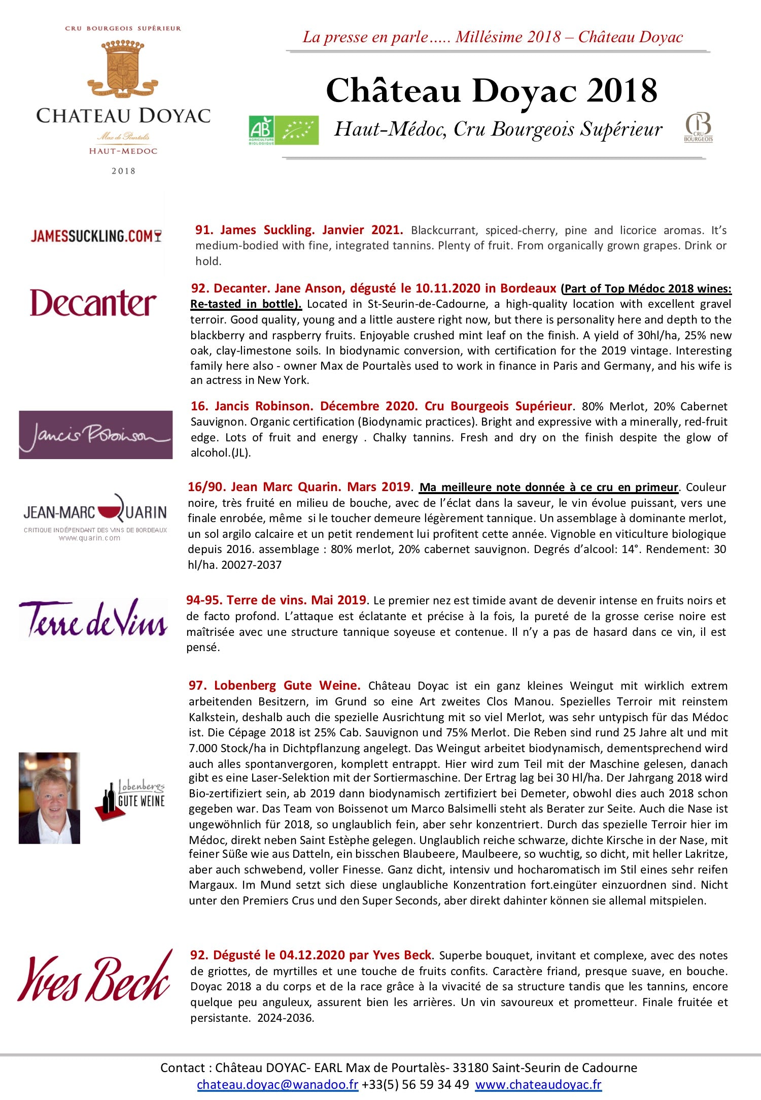 "Superbe bouquet, invitant et complexe, avec des notes de griottes, myrtilles et une touche de fruits confits? Caractère friand , presque suave, en bouche. Doyac 2018 a du corps et de la race grâce à la vivacité de sa structure tandis que les tannins assurent bien les arrières? Un vin savoureux et prometteur. Finale fruitée et persistante." Yves Beck - 92/100