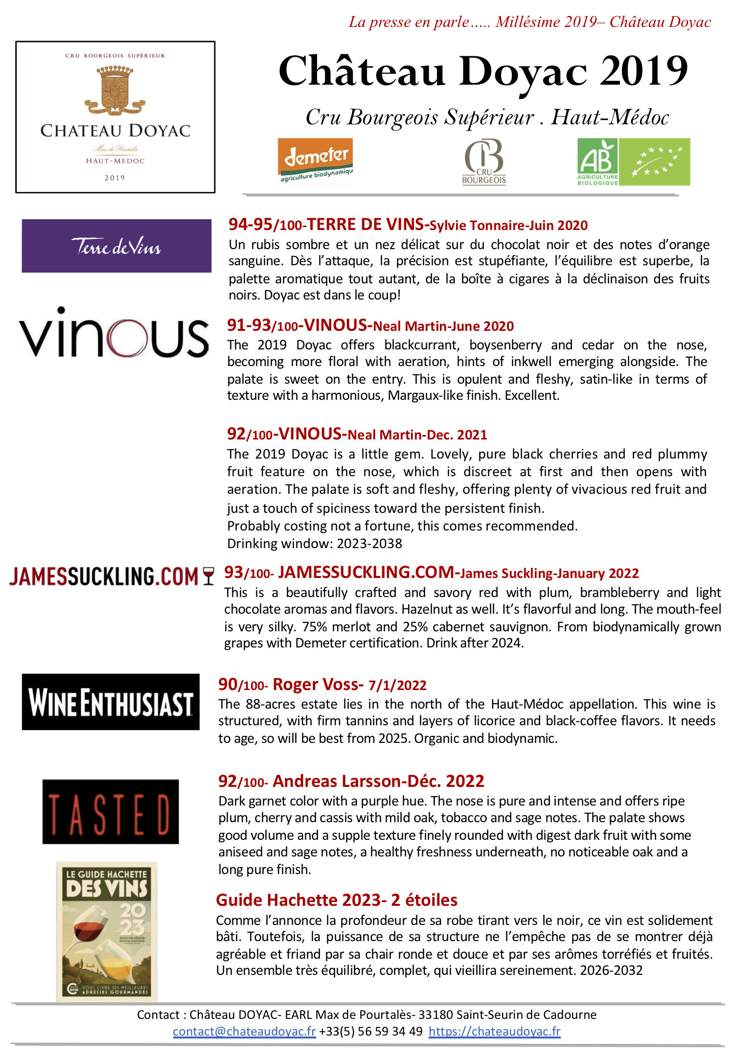 Le château Doyac 2019 est un vin gourmand à dominante merlot, que vous pourrez boire jeune, sur le fruit et la fraîcheur ou attendre encore une dizaine d'années.